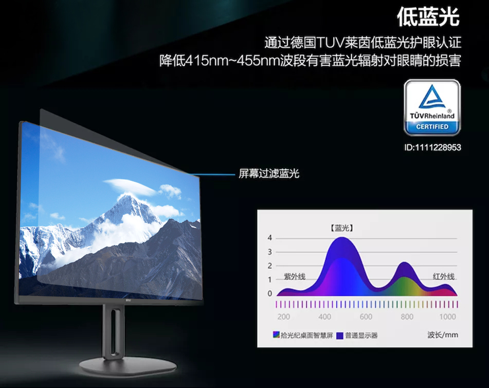 拾光纪SA27D0桌面智慧屏通过硬件滤蓝屏蔽有害蓝光、无频闪、防眩光、无损伽马显示专利技术等多重技术使显示器光线更加柔和、耐看,启动专属护眼模式!